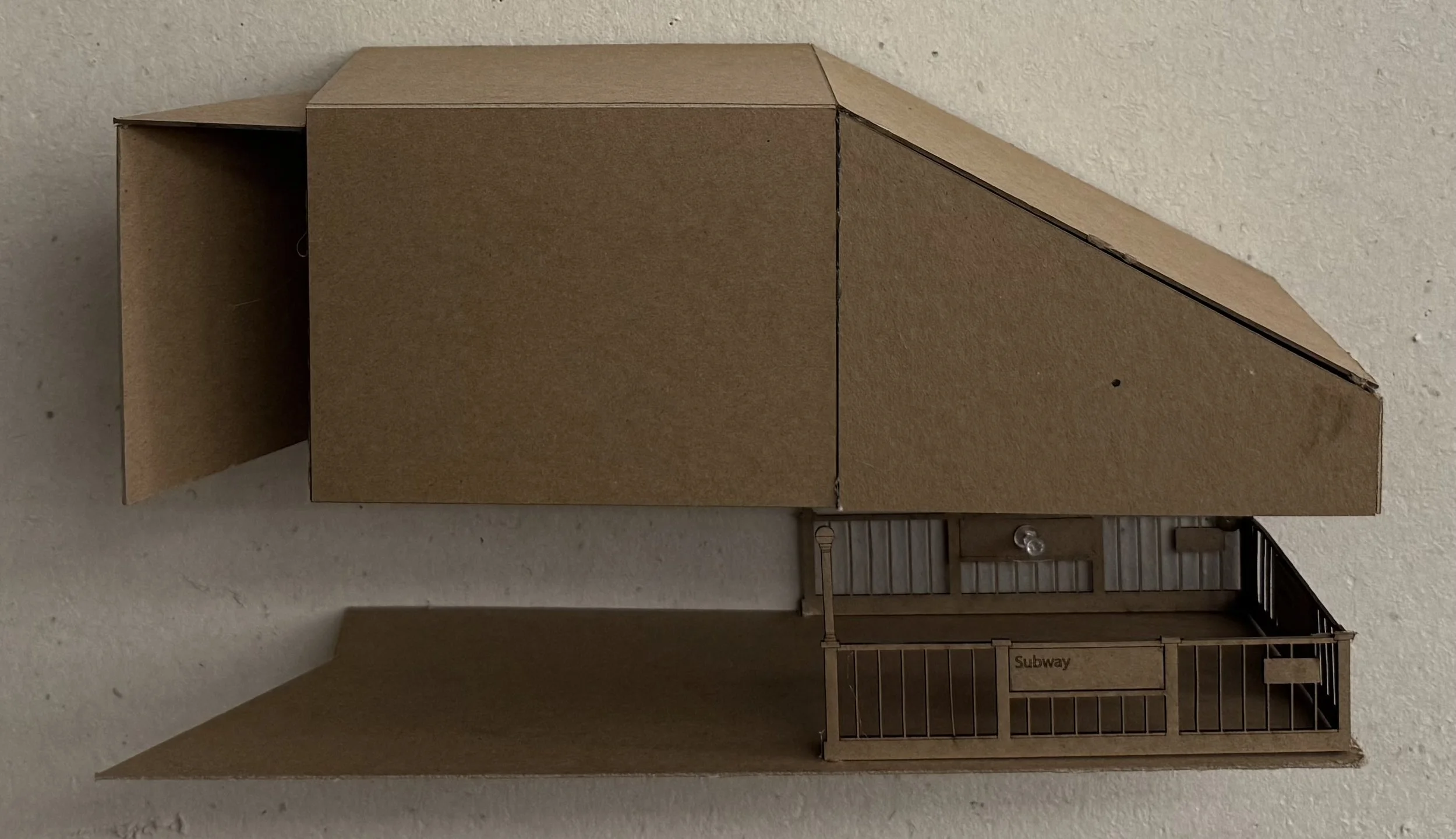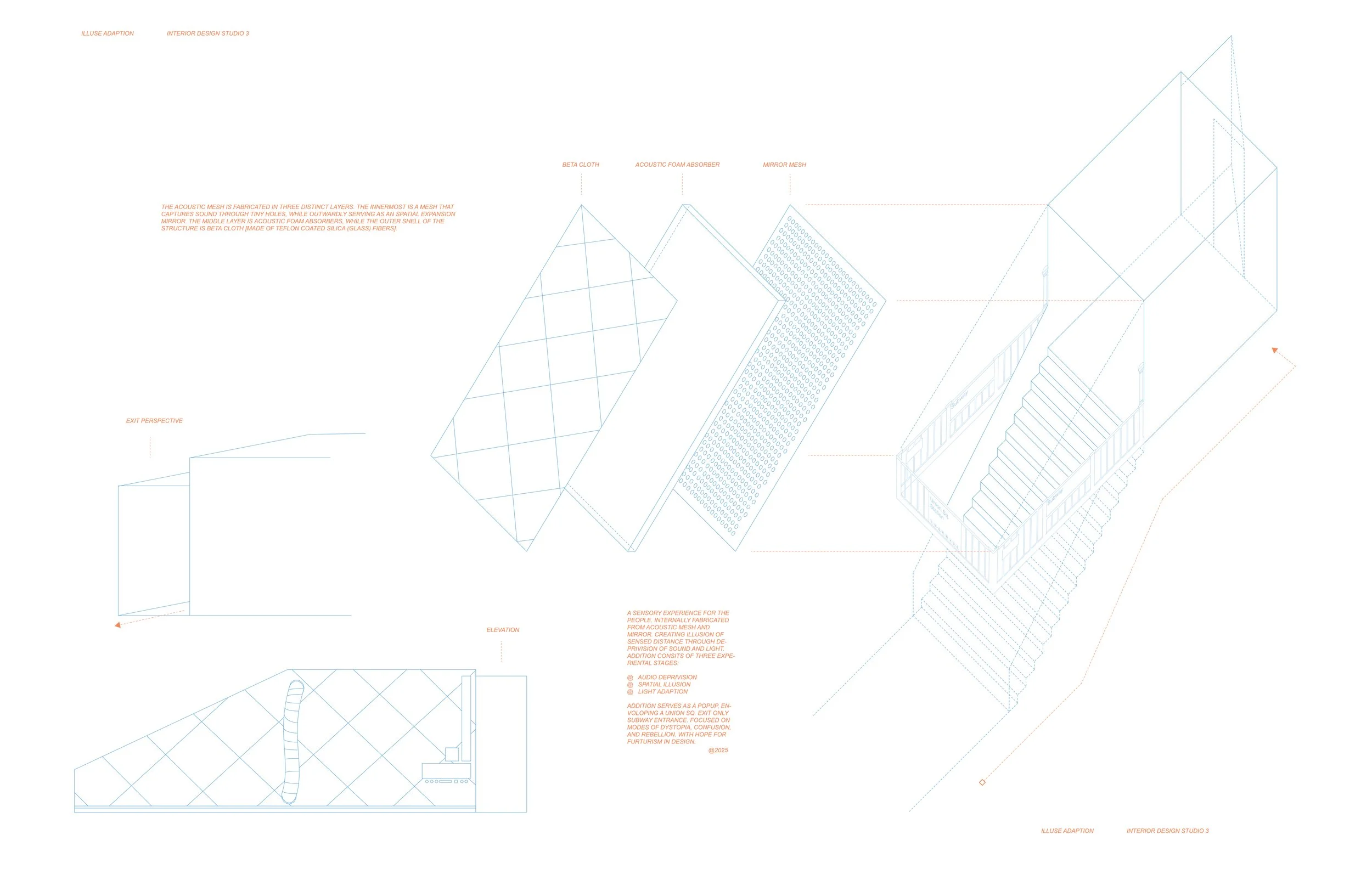 A pop-up sensory experience internally fabricated from acoustic mesh and mirror creating an illusion of sensed distance through a deprivation of sound and light. Consisting of three stages being audio deprivation, spatial illusion, and light adaption. See below for a charcoal representation of the interior experience.