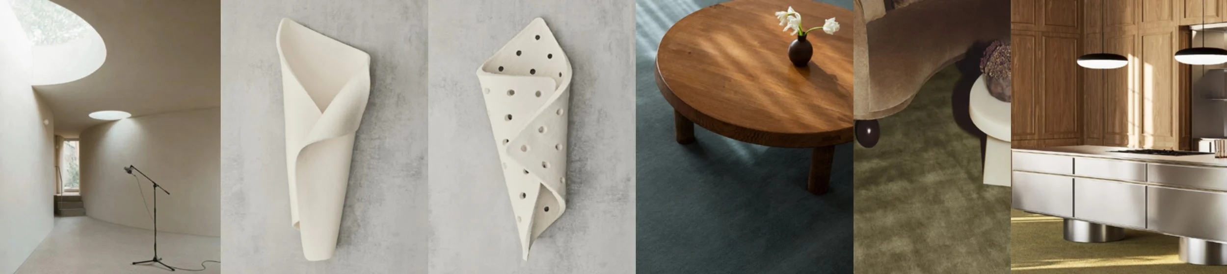 Through Material Selection, the space keeps its ethics rigorous. Using innovative materiality to set example for better methods of consumption. Beginning with a Sustainable Clay Plaster (1) from CayWorks, a brand dedicated creating healthier alternatives. I coat the walls a smooth white with the premixed, pre-pigmented interior wall plaster (100% natural & compostable). The space also uses a seaweed bio-foam as an acoustic (absorption) material. Made by Agoprene, the primarily Norwegian kelp uses minerals from shells and waste from the Norwegian paper industry, creating a 100% biodegradable material with no harmful or petroleum-based chemicals. Used for dropped ceilings and interior stuffing for furniture. One of the most used materials in the space is carpet. Though difficult to remain cognizant in proper eco-friendly practice due to the realities of the carpet industry, Nordic Knots is dedicated to all natural, untreated wool and cotton. Meaning the material is biodegradable but also possible for circulation and reuse post use. The last two materials are wood and polished metal; since minimal in their application, this is perfect opportunity to use recycle materials. A lost art in modern day high-end design, recycled sourcing benefits the space in detail... finalizing the material selection for this project.